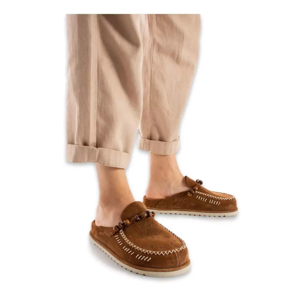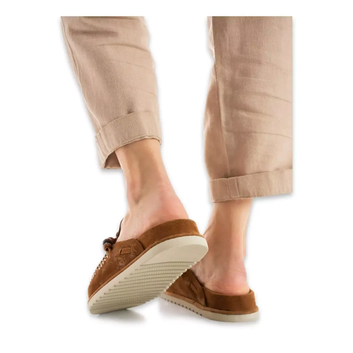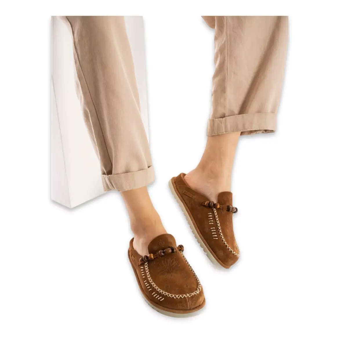 Ürünün tabanı Eva malzemesinden üretilmiştir. İç ve dış malzemesi için %100 Deri kullanılmıştır.